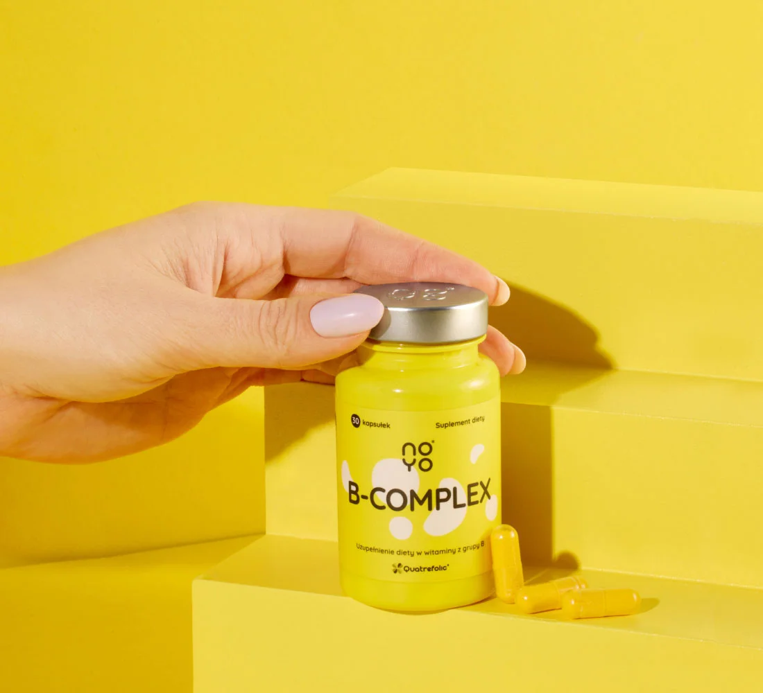 Вітаміни групи B необхідні для правильного функціонування нервової, кровоносної та імунної систем. Вони також впливають на загальний енергетичний метаболізм. На жаль, стресова робота, швидкий темп життя, інтенсивні тренування або невідповідно збалансовані прийоми їжі можуть порушувати оптимальну концентрацію цих вітамінів в організмі. Добавка NOYO® B-Complex - це доповнення щоденного раціону необхідним для правильного функціонування організму набором вітамінів групи B, формула якого забезпечує швидке всмоктування та максимальне використання поживних речовин, що містяться в ньому.