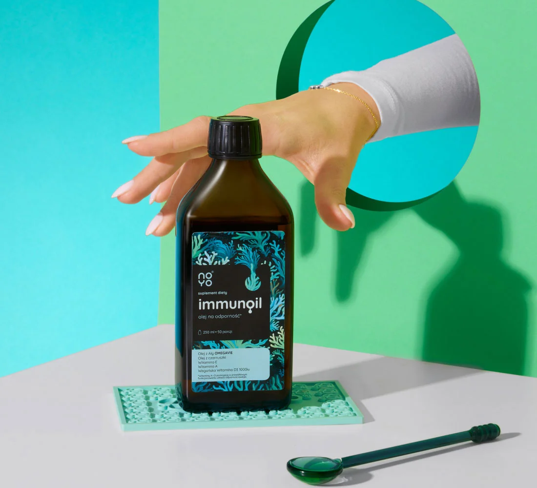 NOYO® ImmunOil — це відповідно підібрані рослинні олії, які постачають кислоти омега-3-6-9. Вони регулюють запальні процеси, а також функціонування як нервової, так і імунної систем. Тимохінон, що міститься в олії чорного кмину, виявляє імуномодулюючі властивості, що може зменшувати, зокрема, симптоми алергії. Лляна олія є багатим джерелом альфа-ліноленової кислоти (ALA), яка підтримує ліпідний баланс, а олія з водоростей постачає DHA, яка є ключовою для правильної роботи мозку та клітинного імунітету. Додавання вітамінів A, D та E ефективно зміцнює імунітет, захищає від окислювального стресу. Завдяки поєднанню цих інгредієнтів добавка виявляє позитивну протизапальну дію, яка покращить загальний стан організму.