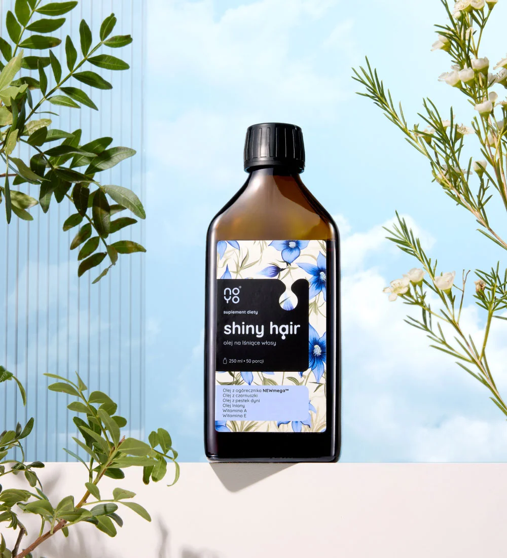 Продукт є доповненням щоденного раціону високоякісними жирними кислотами Омега 3, 6 і 9 та вітамінами A і E. Особливо кислоти Омега 3 дуже важко отримати разом з їжею. Тому NOYO® Shiny Hair Oil можна застосовувати постійно, без перерв у суплементації продукту.